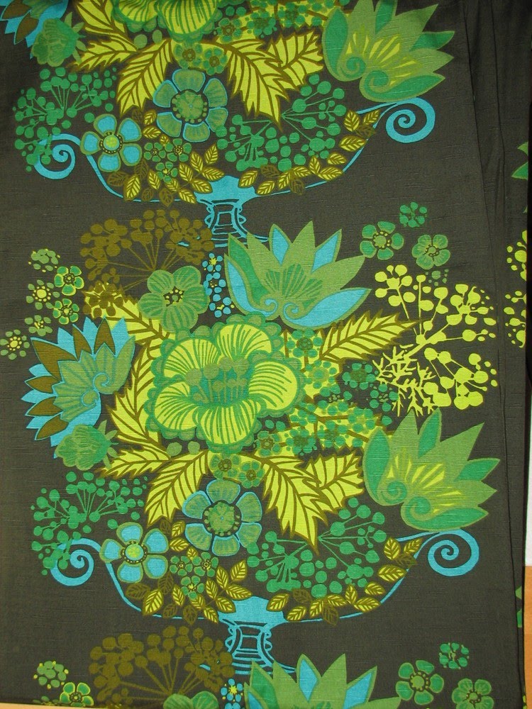 Det finns många proffsiga formgivare inom textilbranschen kan man konstatera om man börjar sätta sig in i det lite grann som jag gjort på sistone. Stilarna varierar mycket, och det är svårt att säga vad man gillar allra bäst. Drömmen är ju att hitta fina 50-talstyger från någon av våra stora formgivare som Stig Lindberg,Viola Gråsten och Sven Markelius eller något vackert från senare formgivare som Sven Fristedt, Maija Isola, 10-gruppen mfl. Man ska nog ha ganska tur, förra besöket på Erikshjälpen missade jag två längder av ett mycket populärt tyg, ”Pompeja” i svart och grönt av Märta-Lena Bjerhagen för Borås med några meter. Irriterande kan tyckas, speciellt när man har minnen av tyget, vi hade ett draperi i mina föräldrars stuga som jag älskade, tyvärr kastade min mor det för några år sen när dom rensade bort en del ur stugan…gaaah säger jag bara. Nu verkar det vara osannolikt populärt bland textilbloggare och syjuntor, så jag lär aldrig hitta det till rimligt pris…suck…